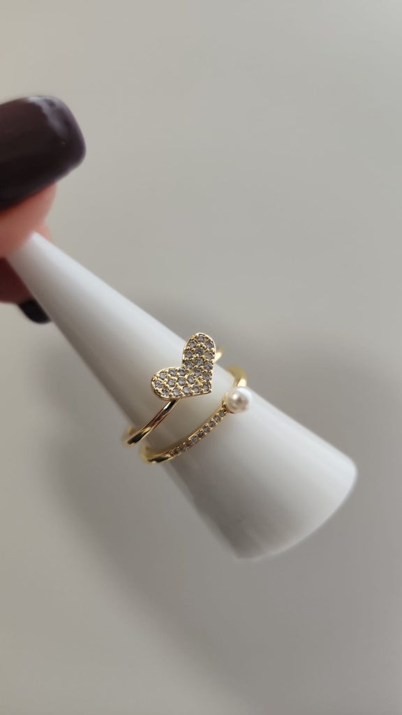 Anillo doble Corazon diamantado y Perla