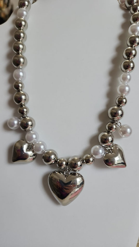 Collar de Esferas Plata y Perlas con Corazones Puff